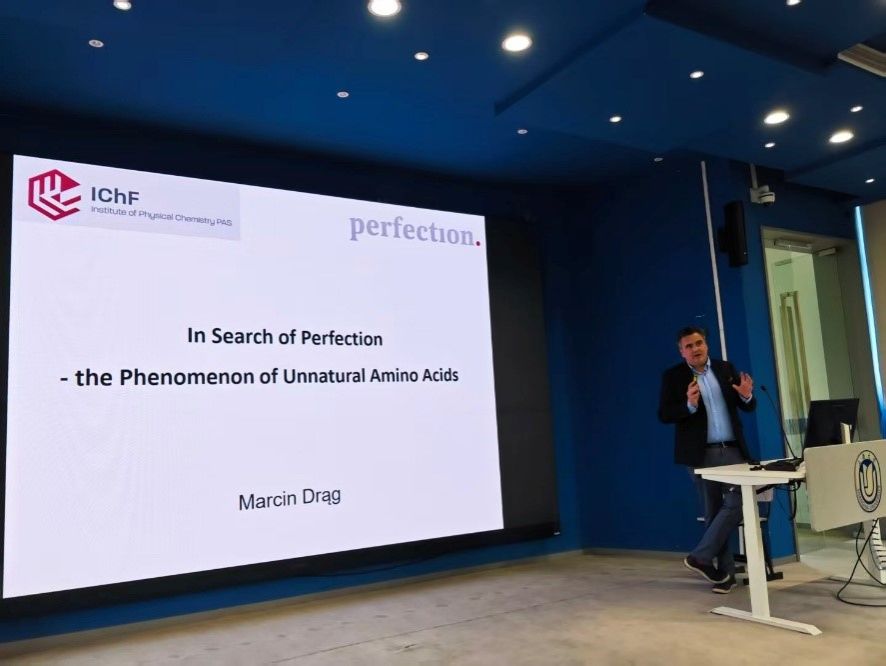 Marcin Drąg教授作了题为“In search of perfection - the phenomenon of unnatural amino acids”精彩报告。介绍了其团队借助一项突破性技术 ——“混合组合底物库”(Hybrid Combinatorial Substrate Library, HyCoSuL),率先开发出针对关键蛋白酶家族的超高灵敏度底物、抑制剂及活性探针(Activity-based probes)的最新科研成果。该技术通过在肽骨架中引入非天然氨基酸,大幅拓展了底物特异性的范围,使蛋白水解活性的探测达到前所未有的分辨率。除诊断领域外,这项技术还为合理药物设计开辟了新方向。例如,依据这些原理设计的蛋白酶抑制剂,是帕罗韦德(Paxlovid)等现代抗病毒疗法的核心成分——这一实例充分体现了HyCoSuL 引导策略在研发新一代精准药物中的变革性潜力。